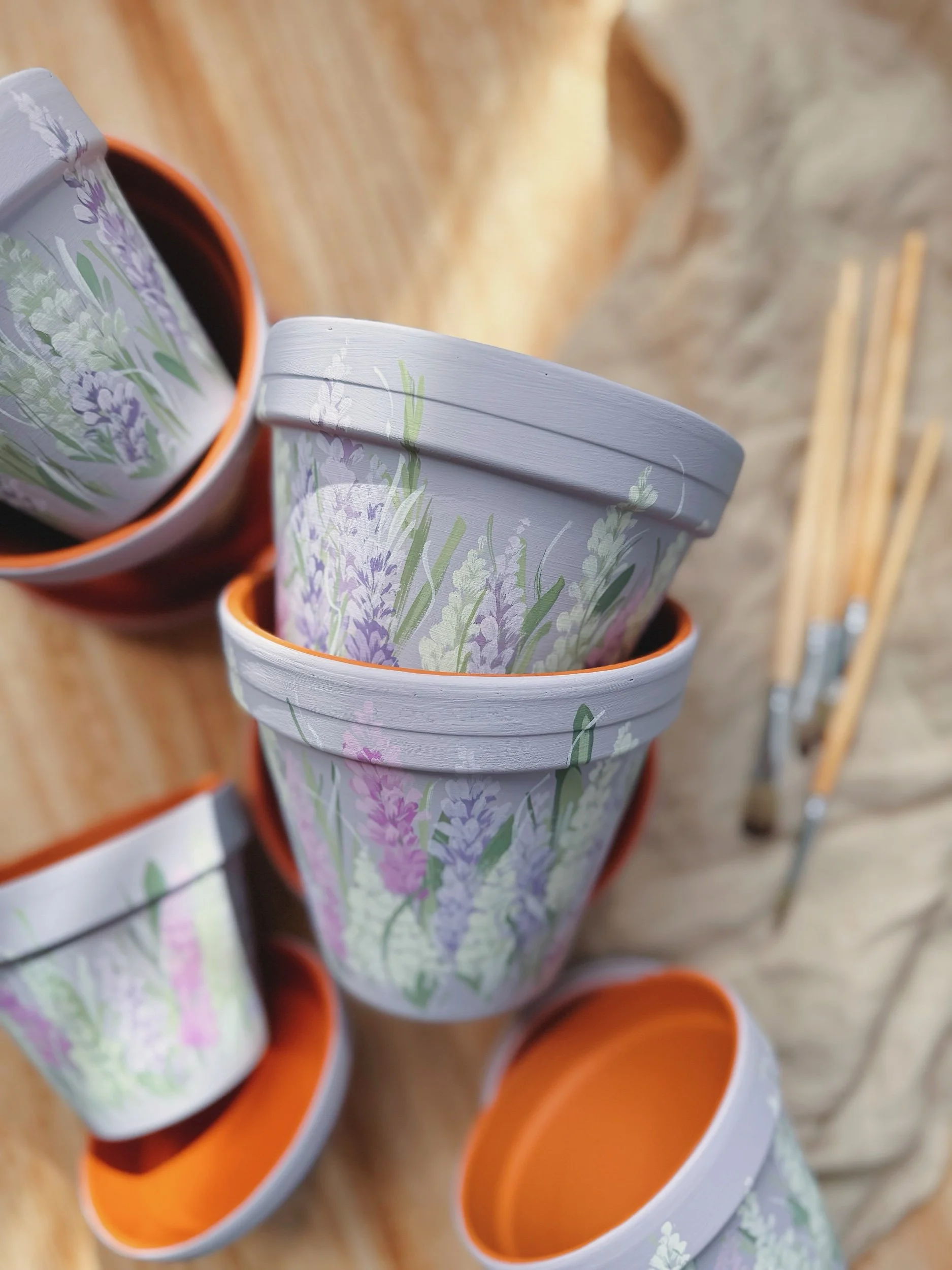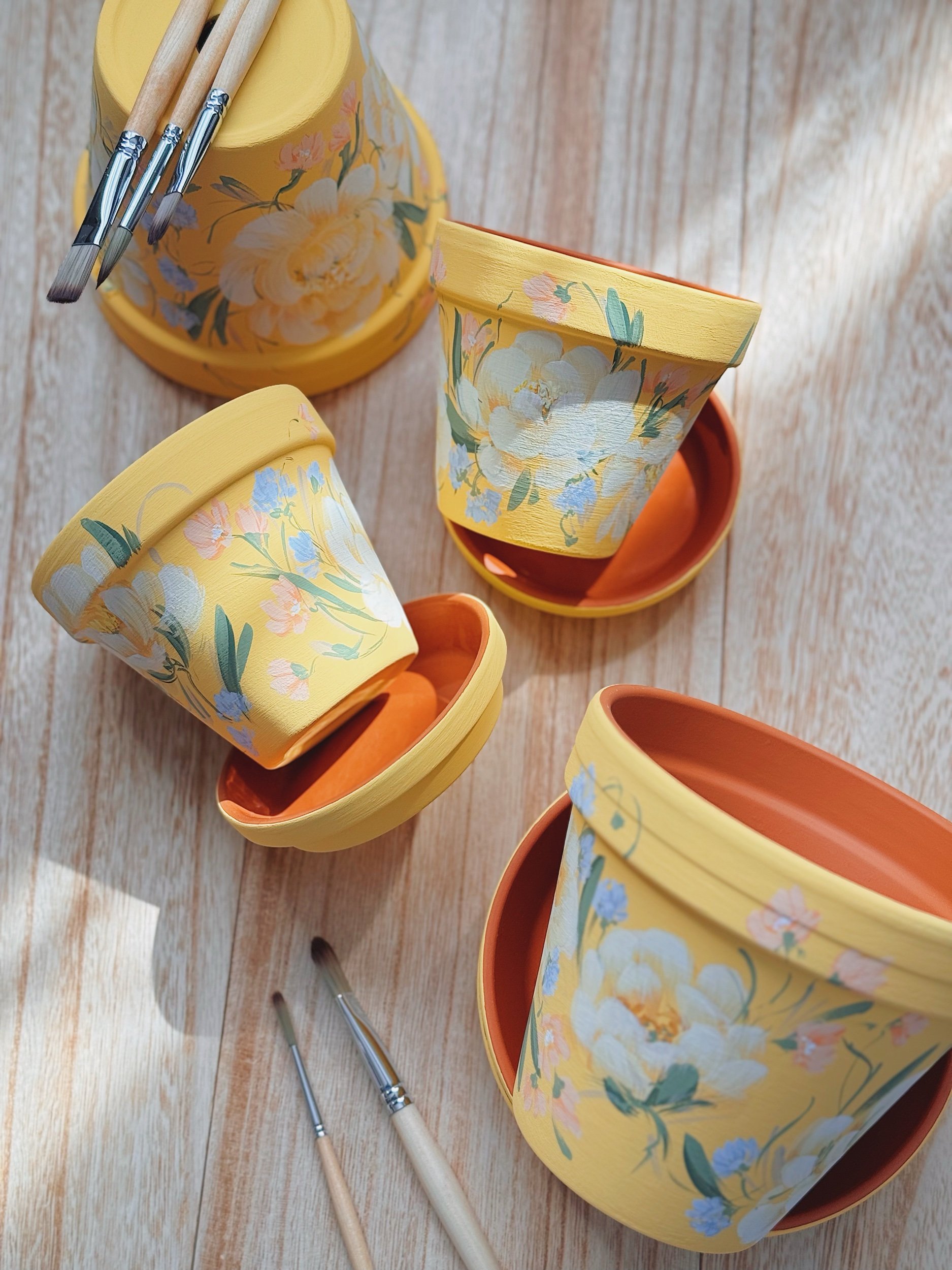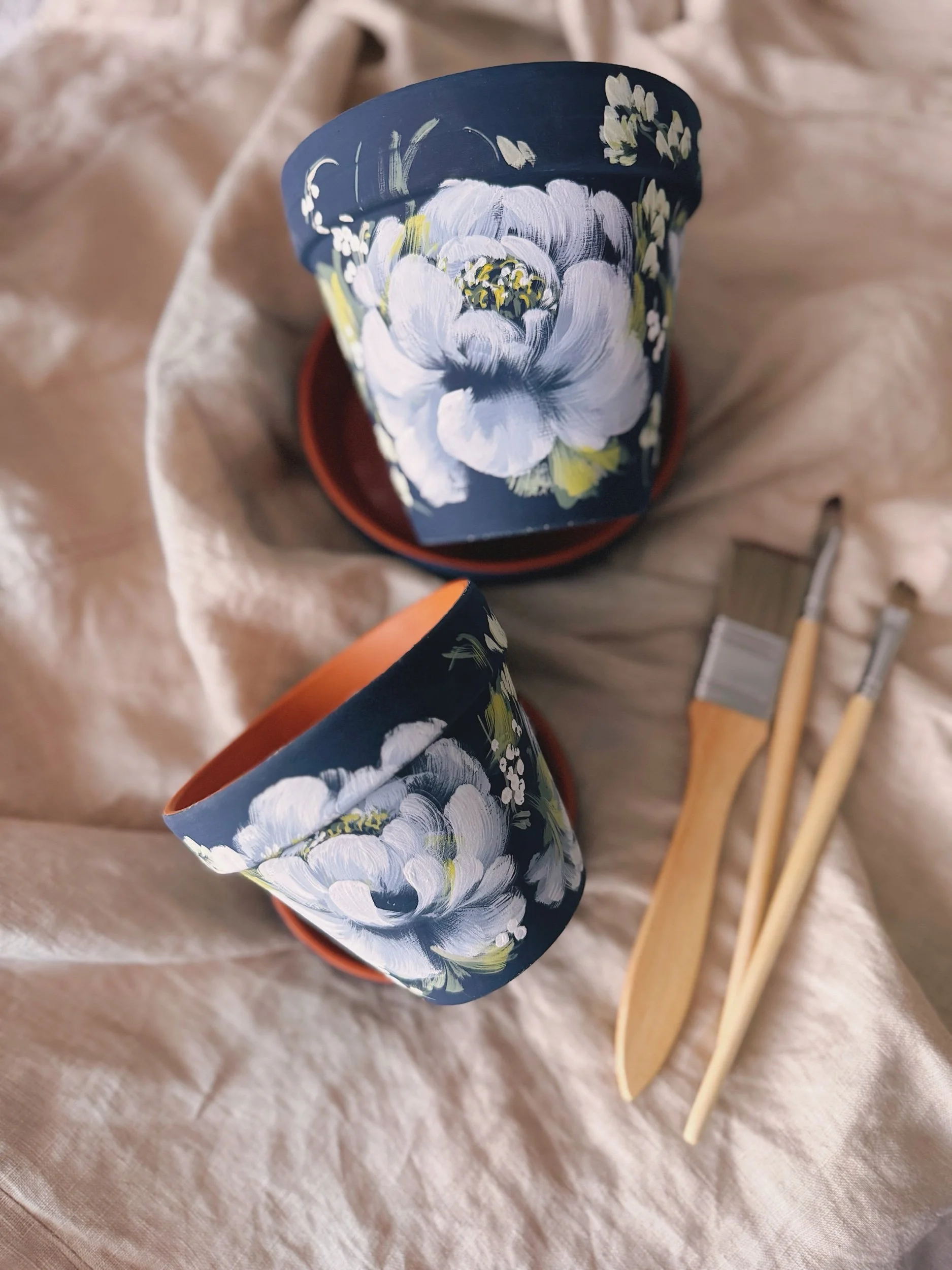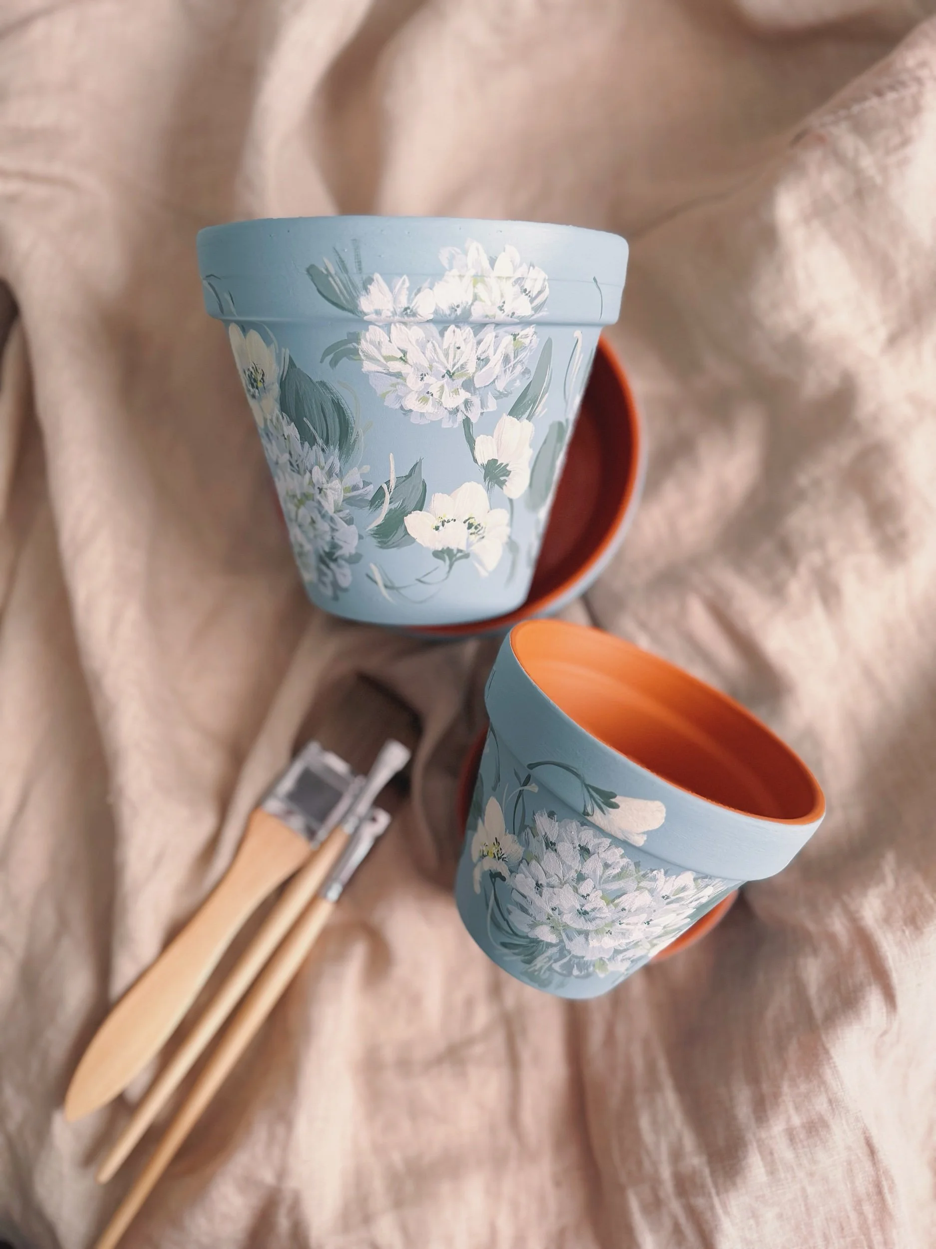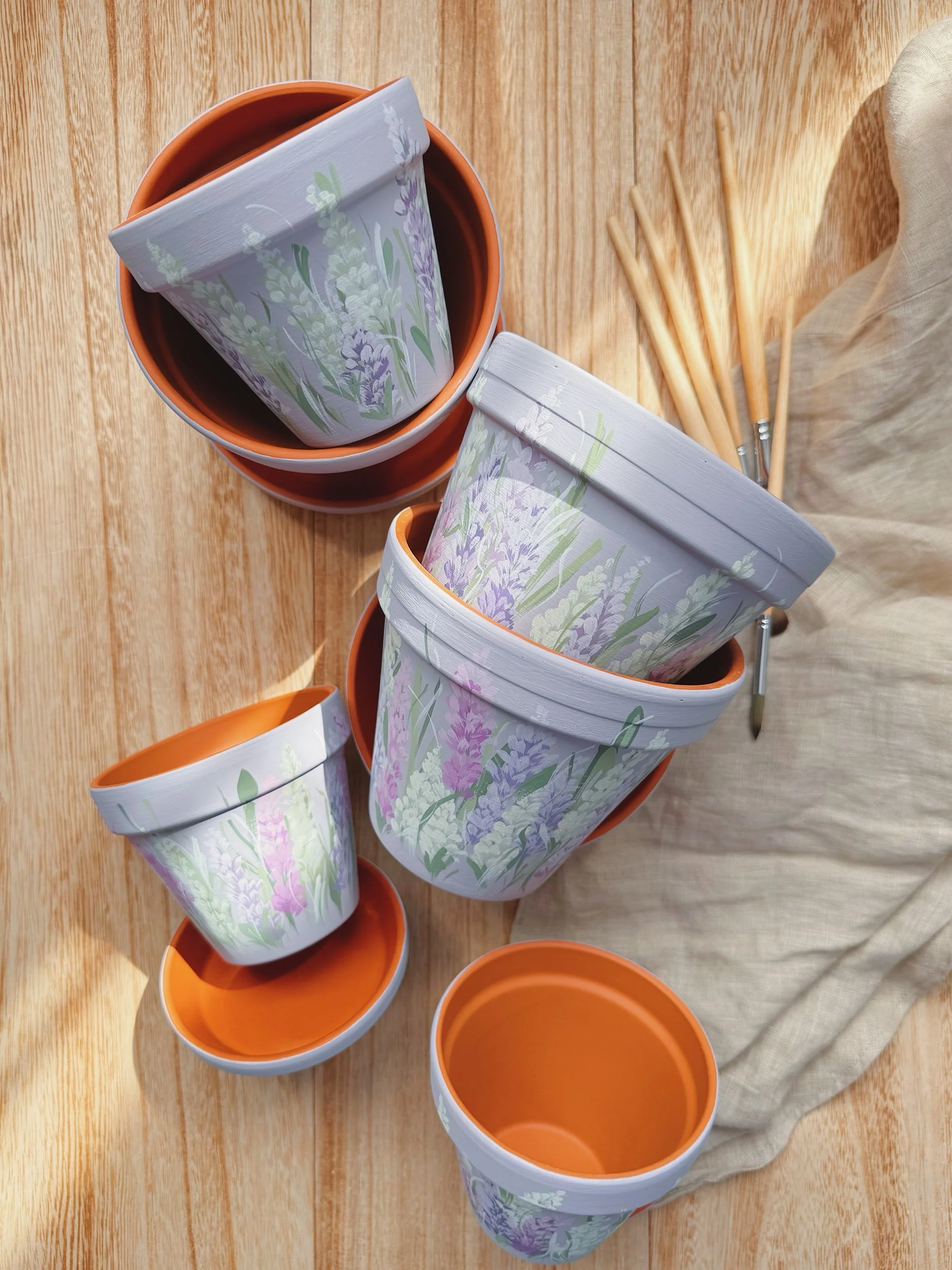 Six hand painted patterns painted on Terracotta planters. Spray coated with matte sealant to keep designs protected from water + the elements.