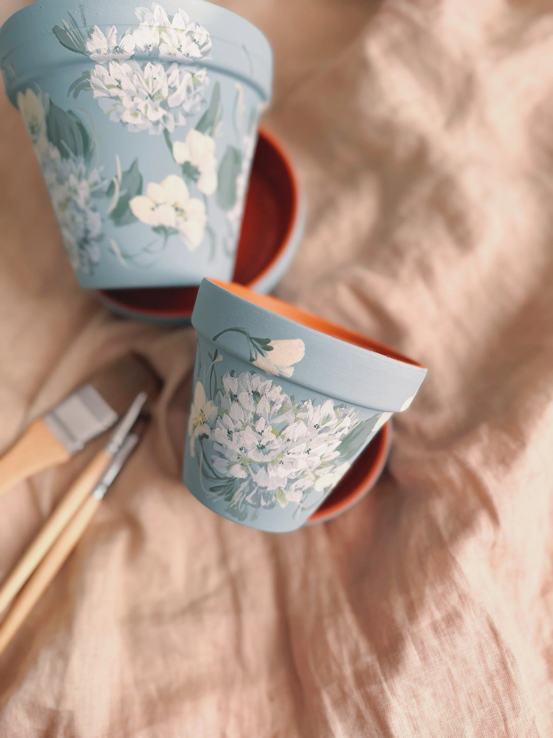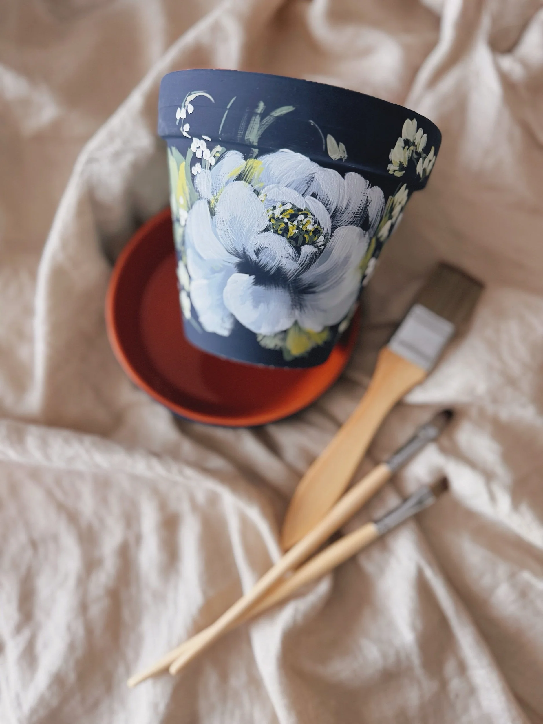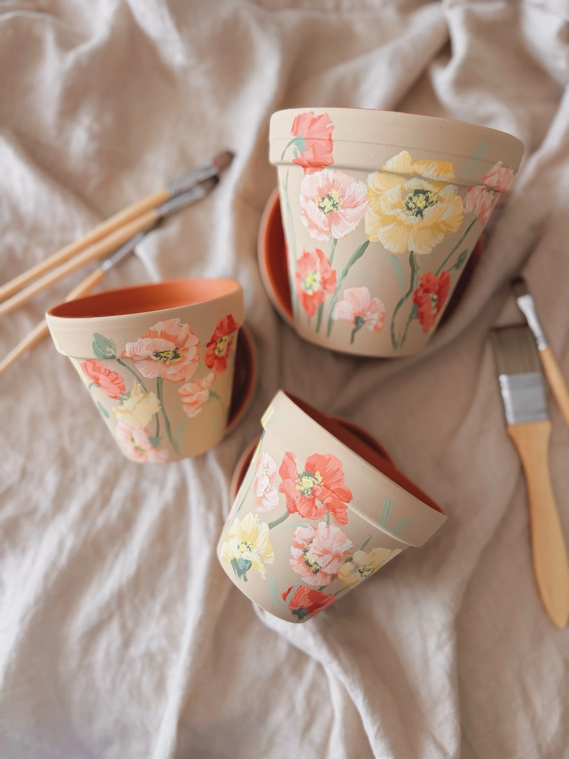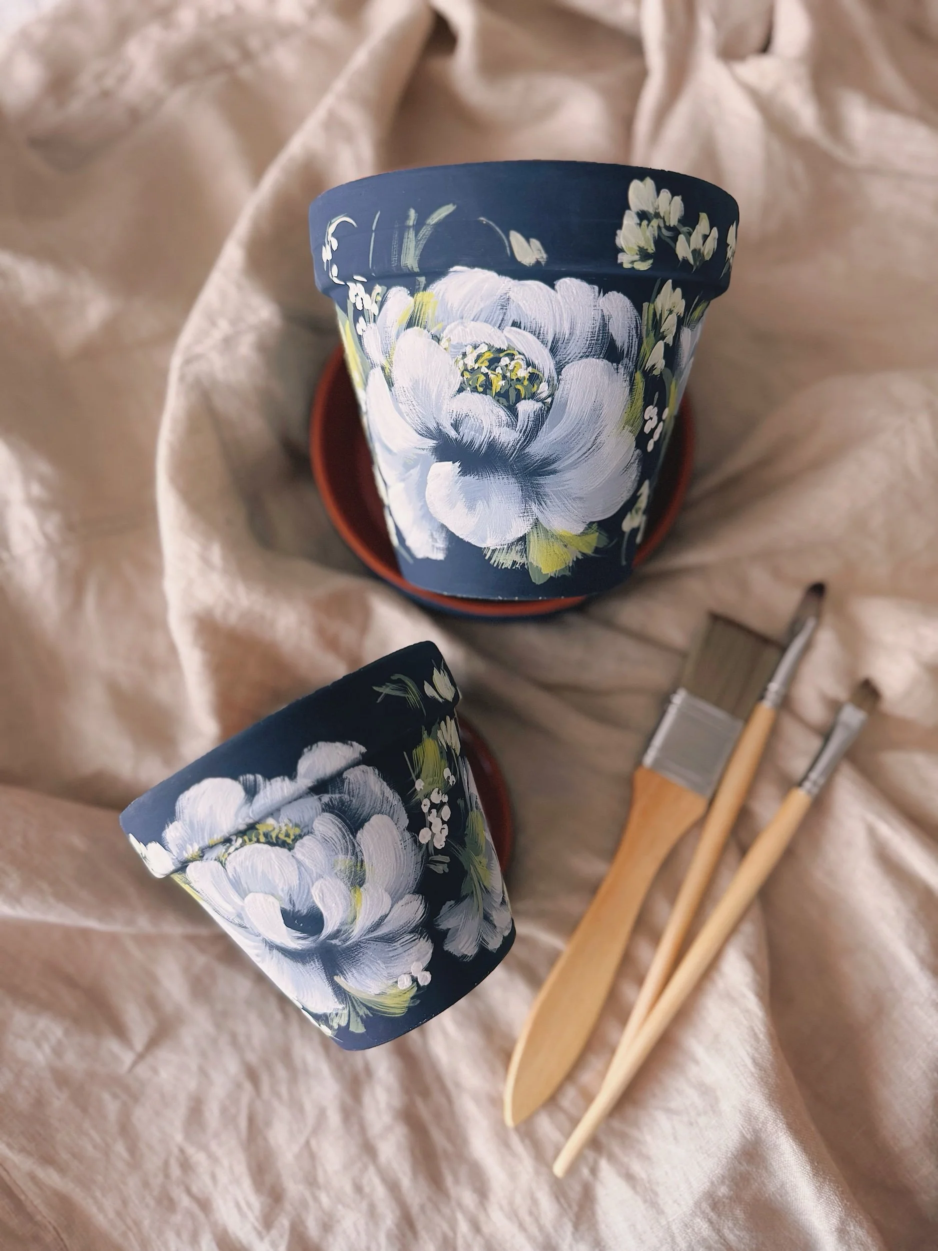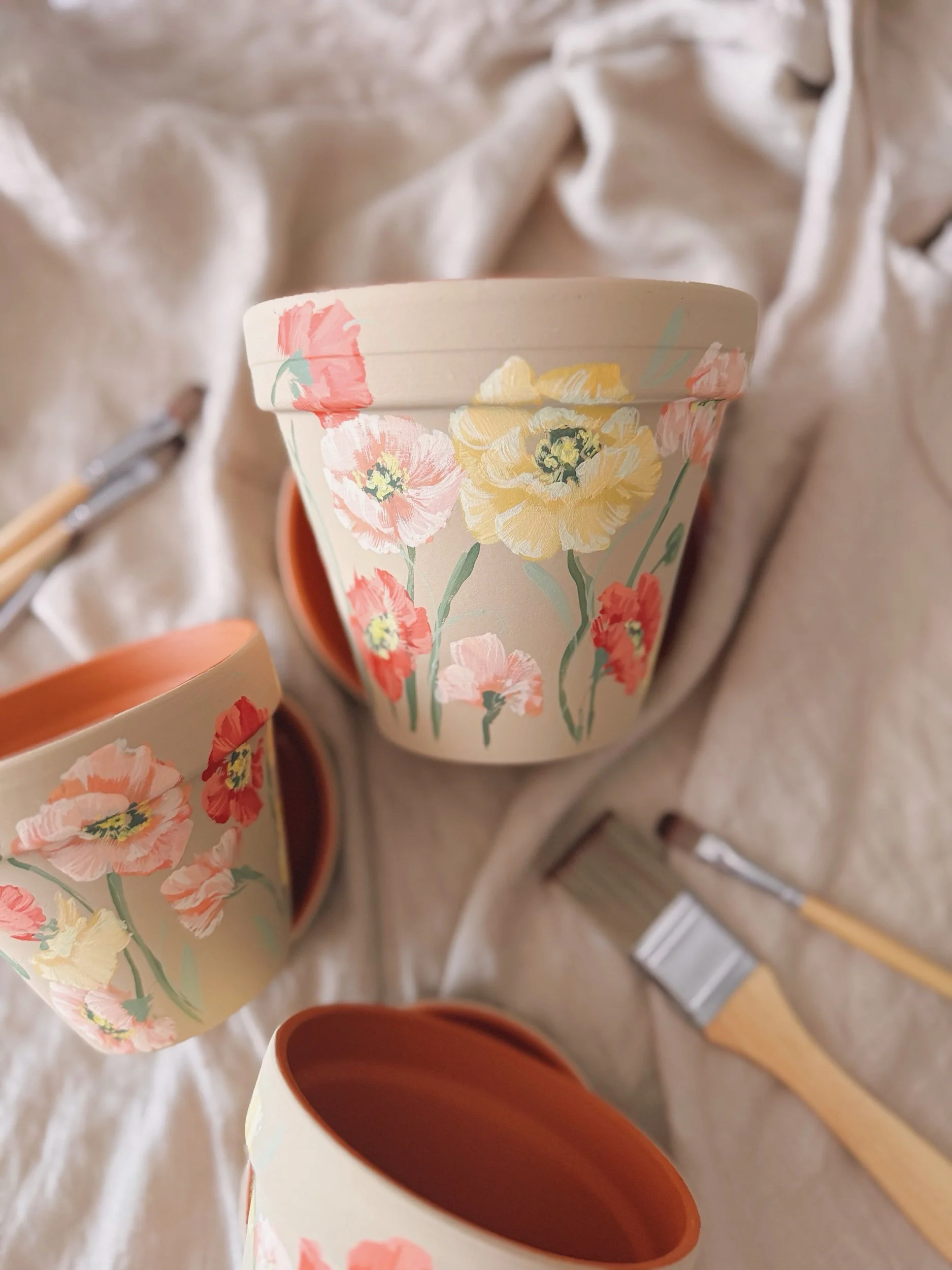 Six hand painted patterns painted on Terracotta planters. Spray coated with matte sealant to keep designs protected from water + the elements.