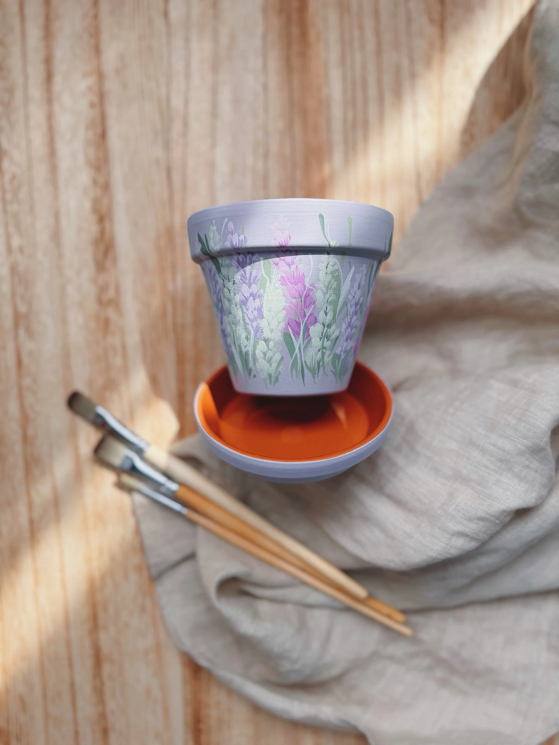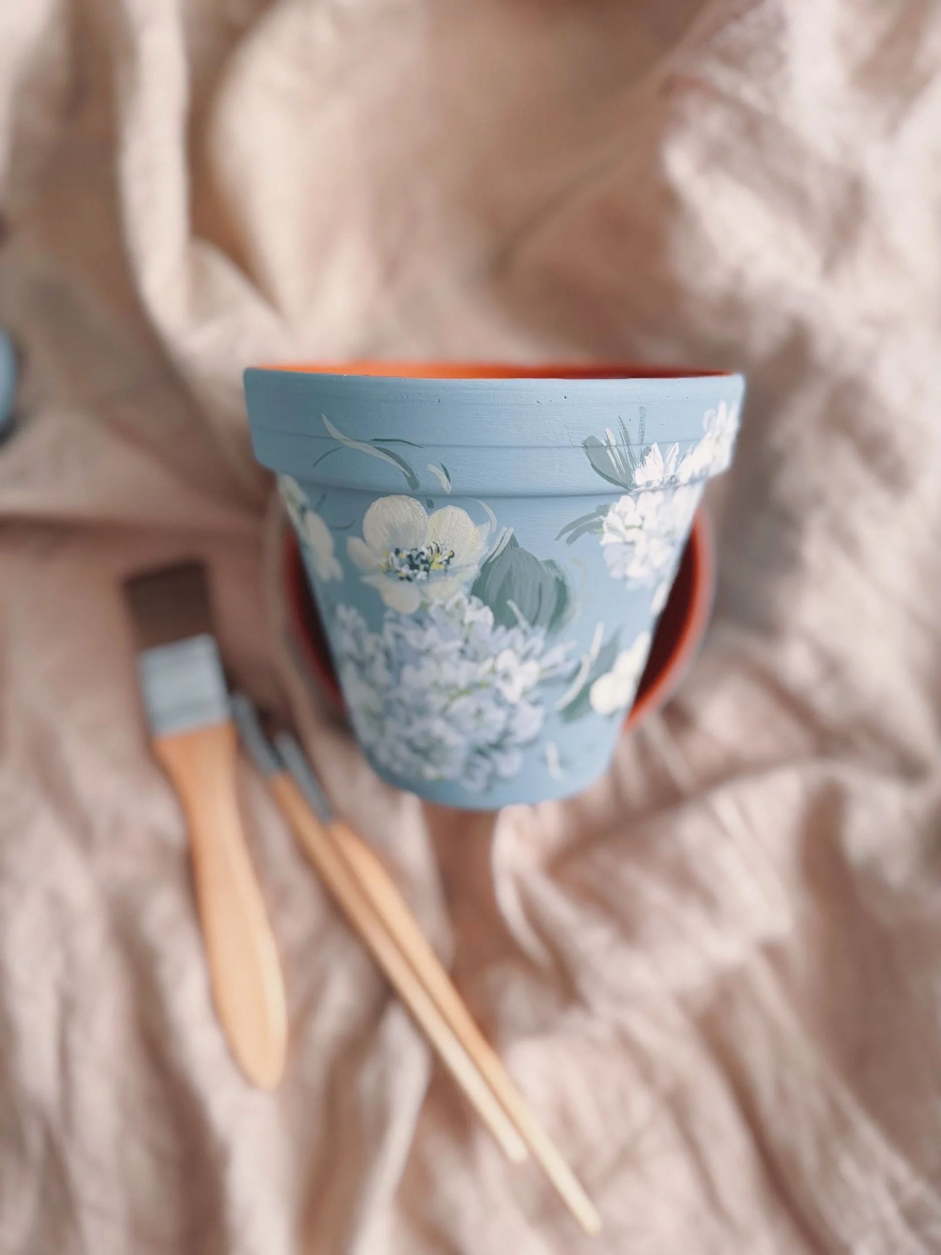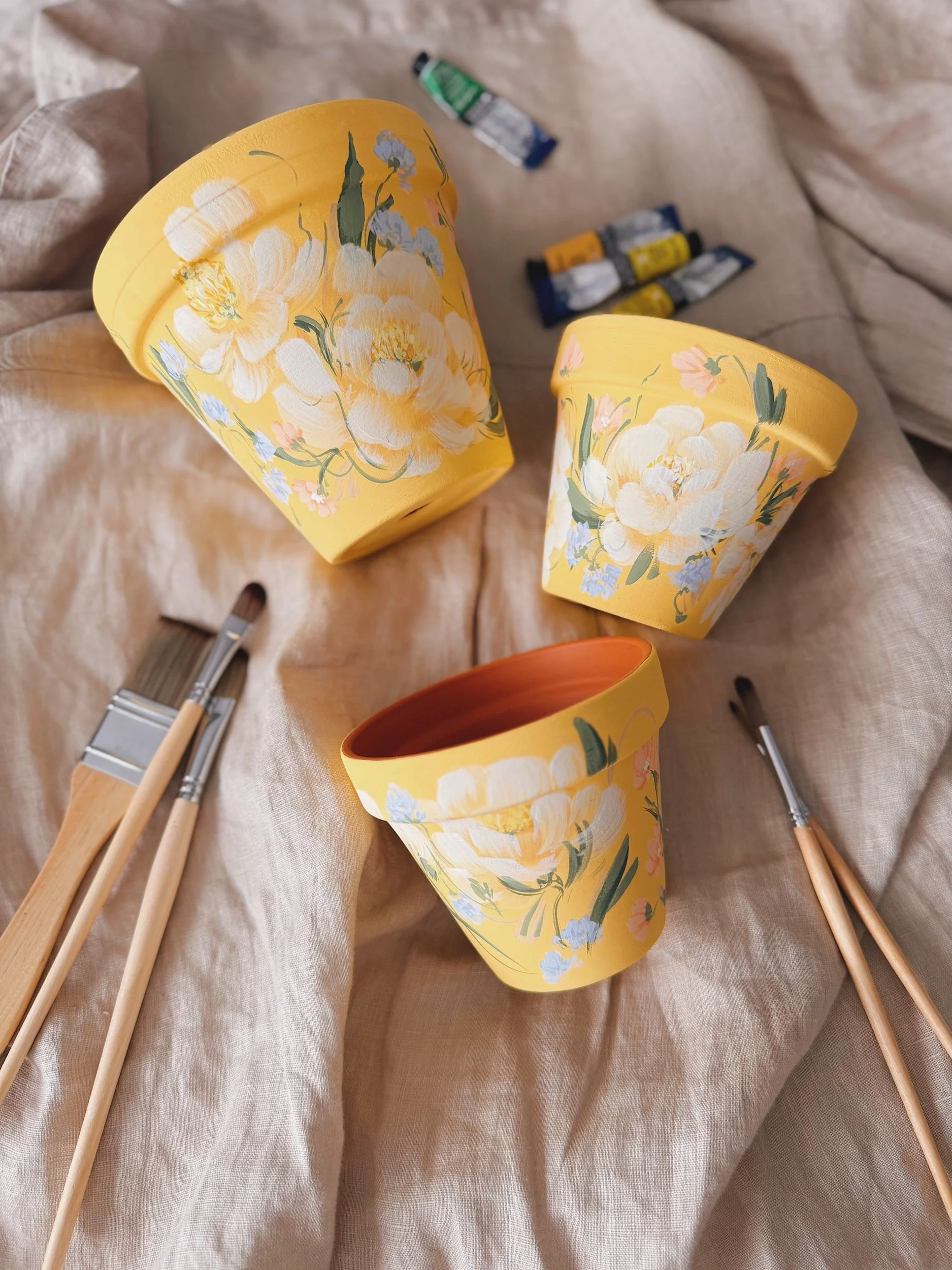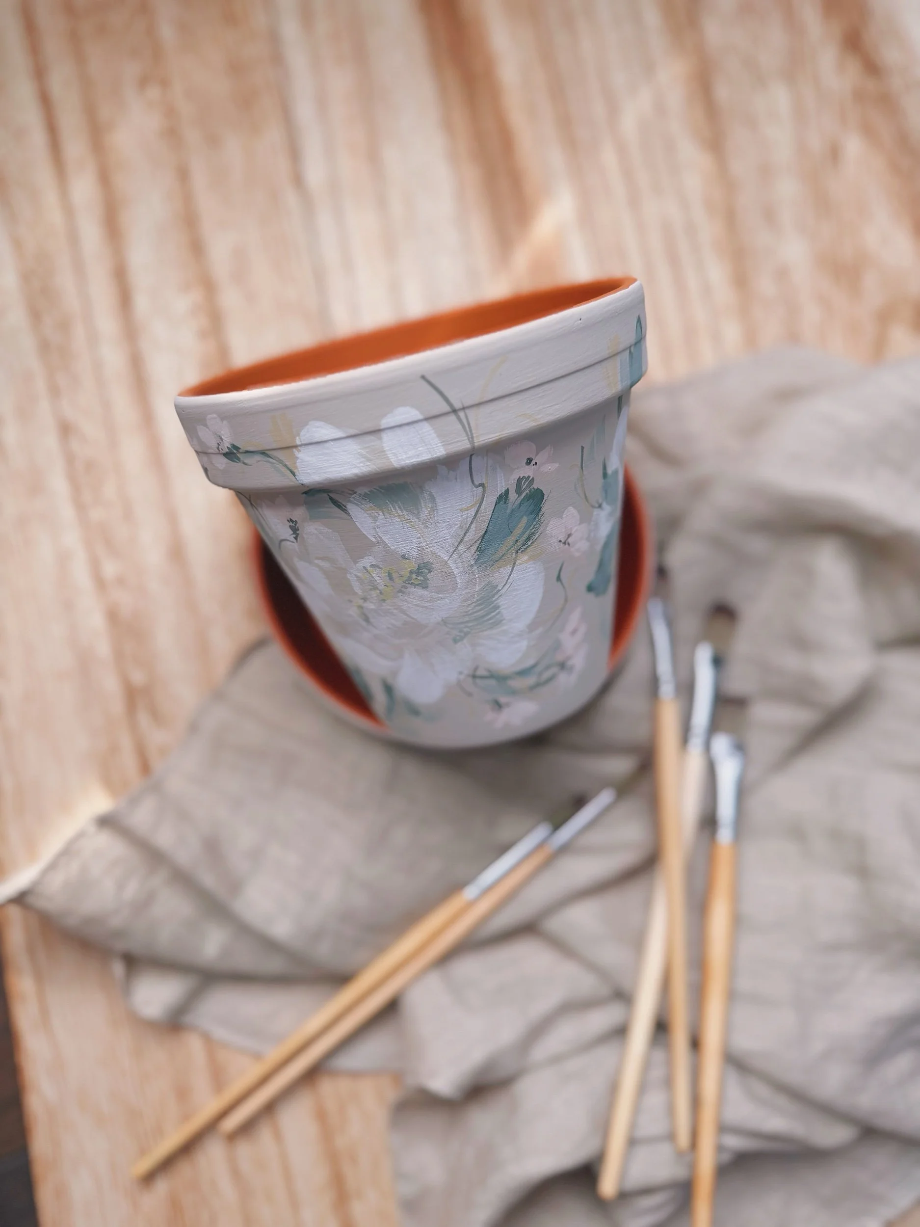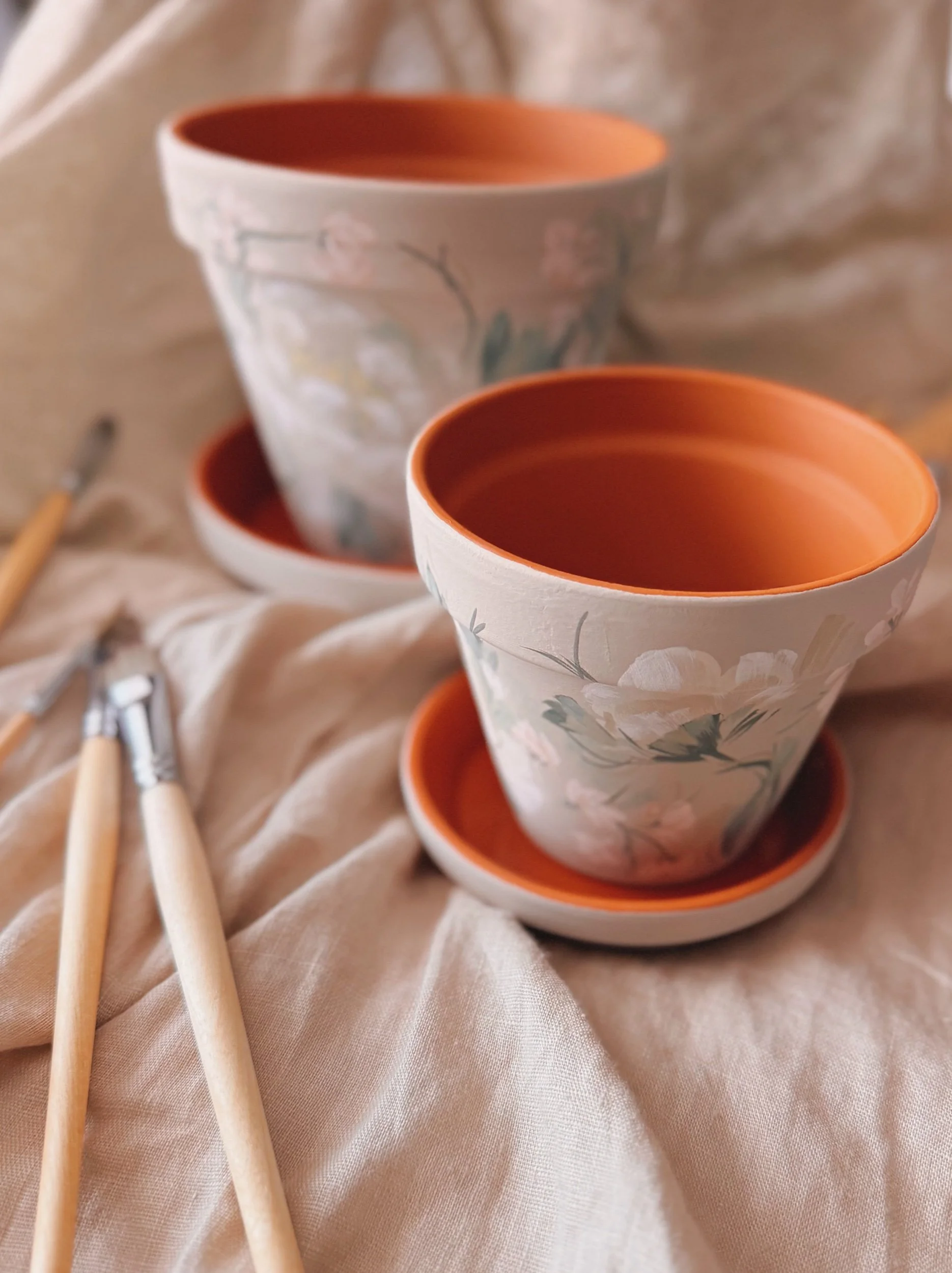 Six hand painted patterns painted on Terracotta planters. Spray coated with matte sealant to keep designs protected from water + the elements.