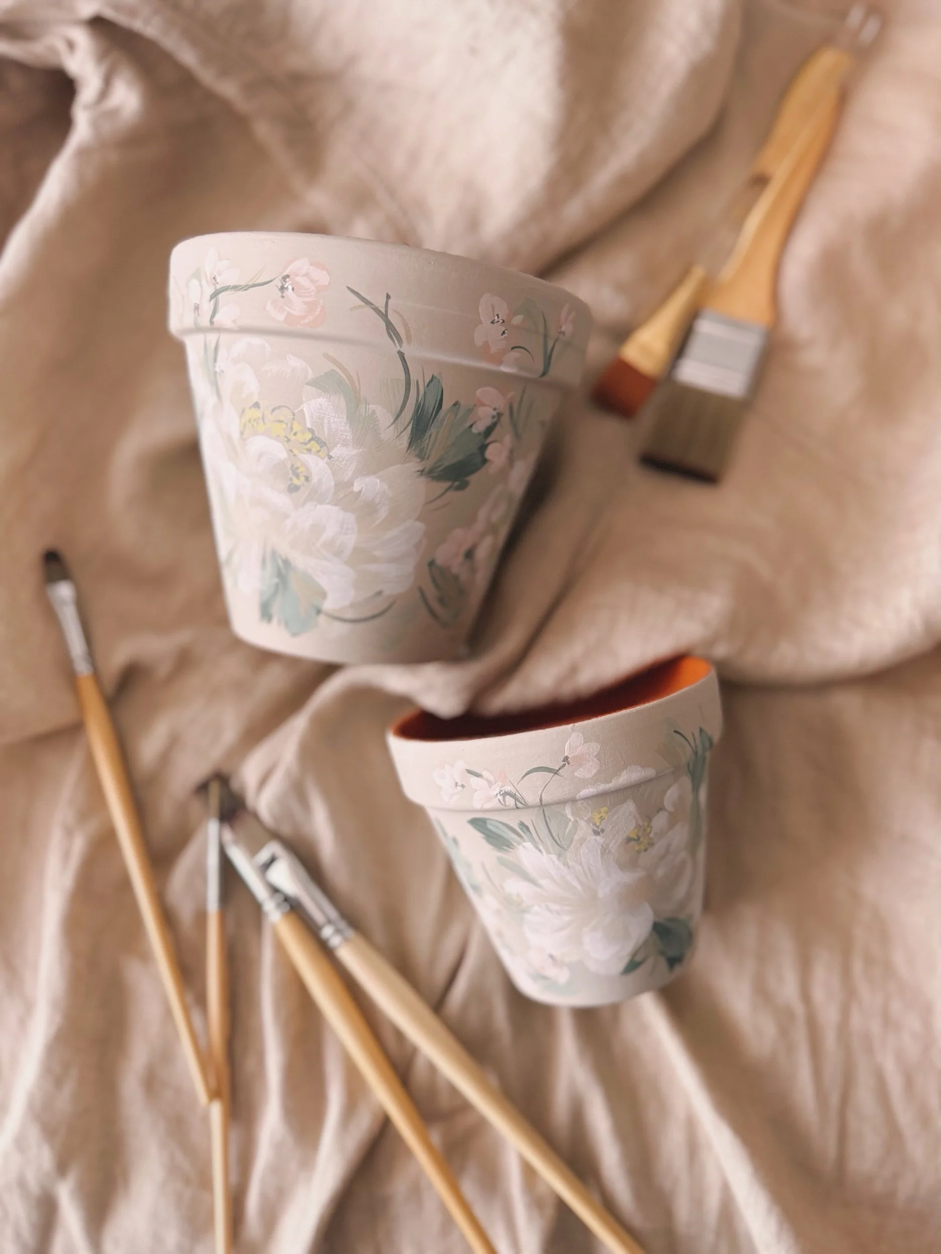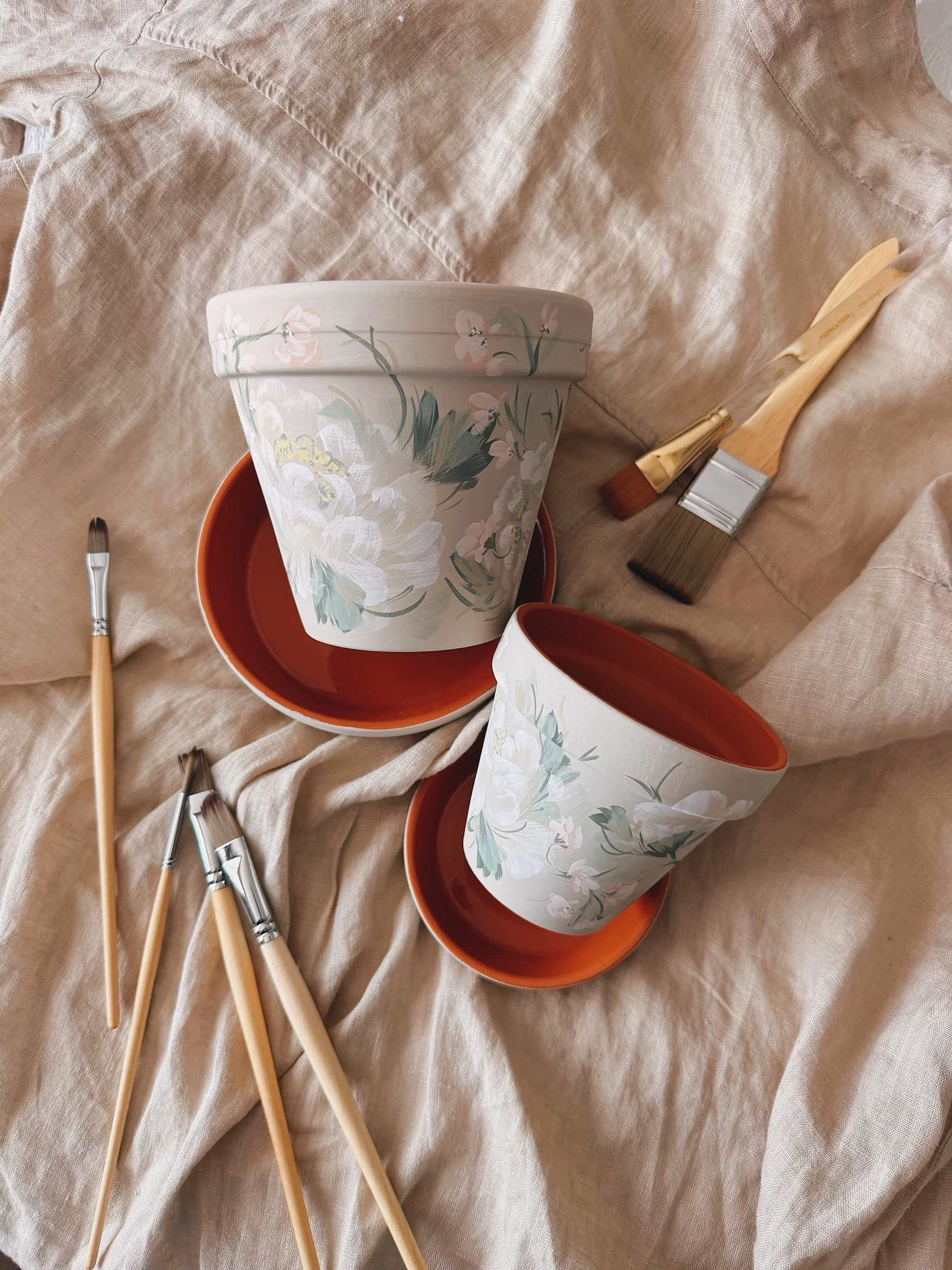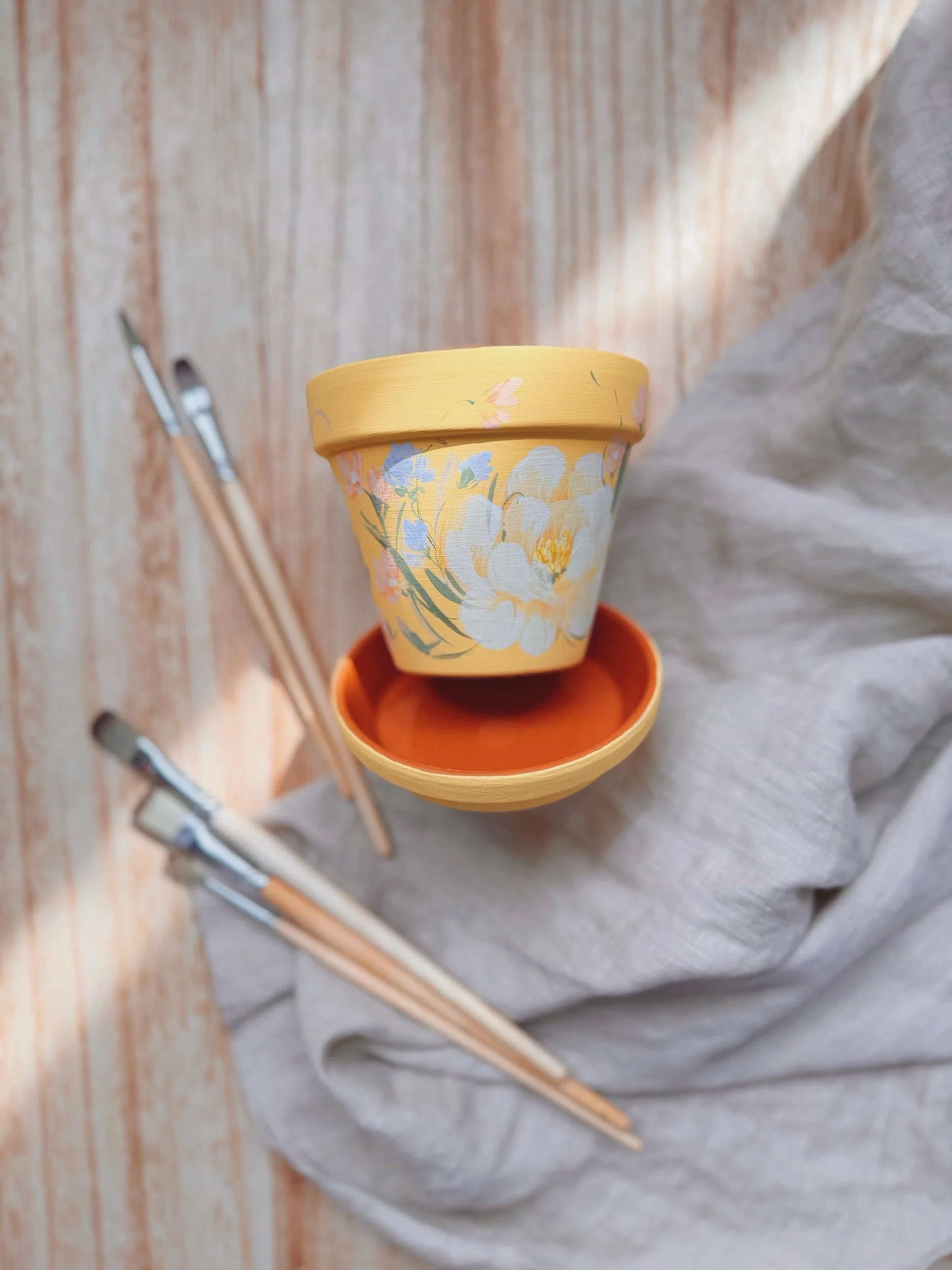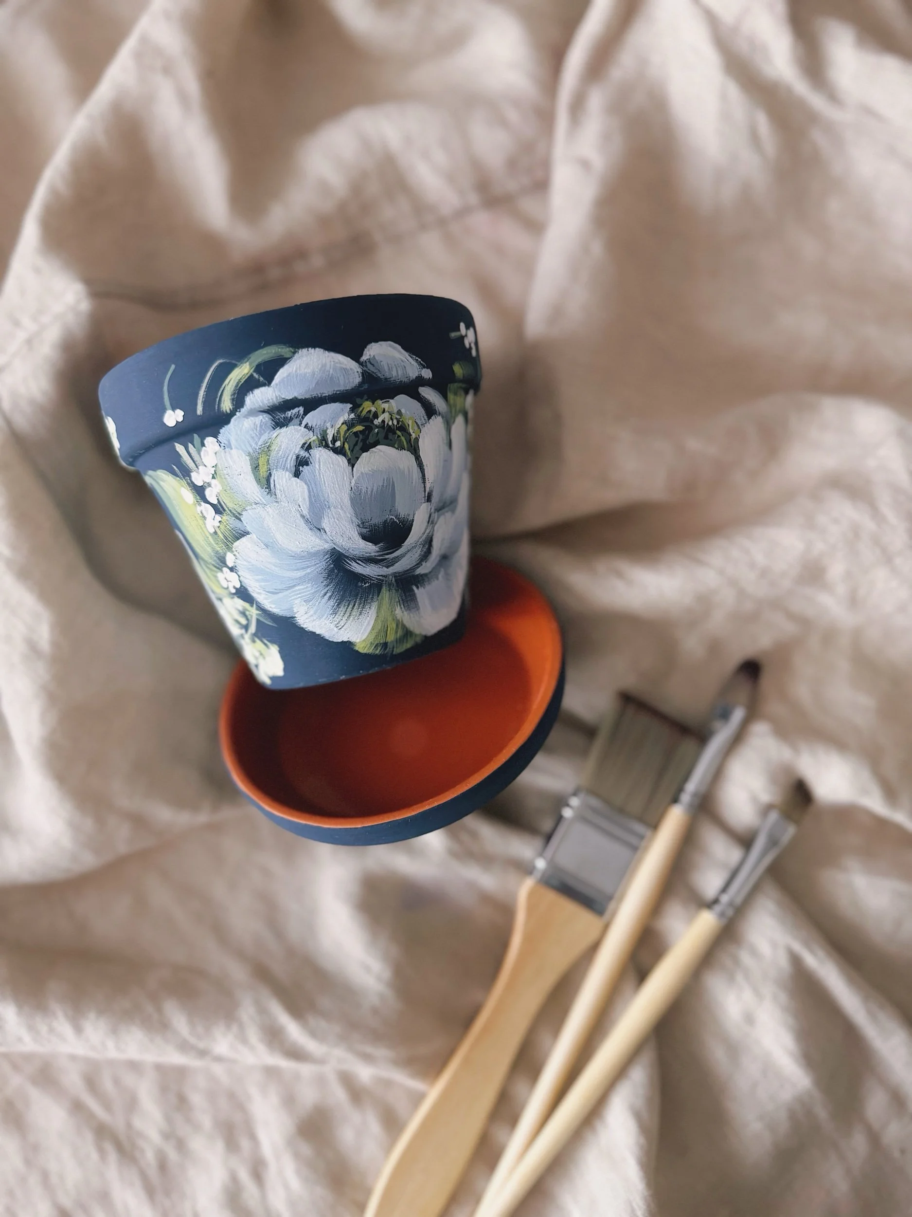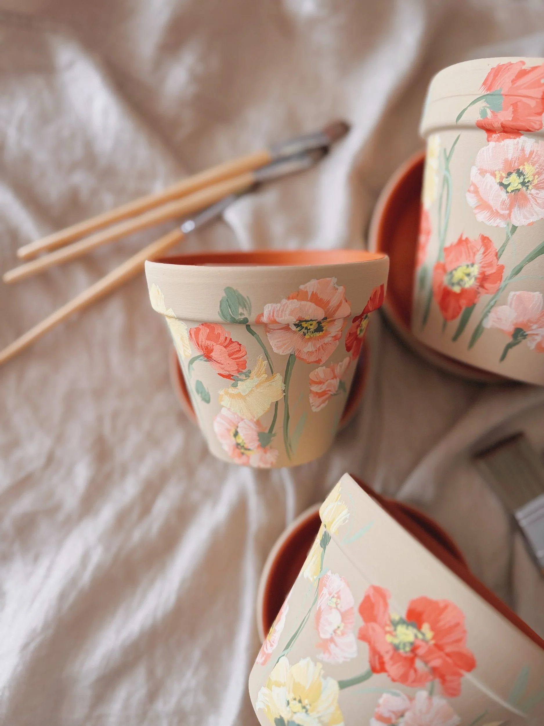 Six hand painted patterns painted on Terracotta planters. Spray coated with matte sealant to keep designs protected from water + the elements.