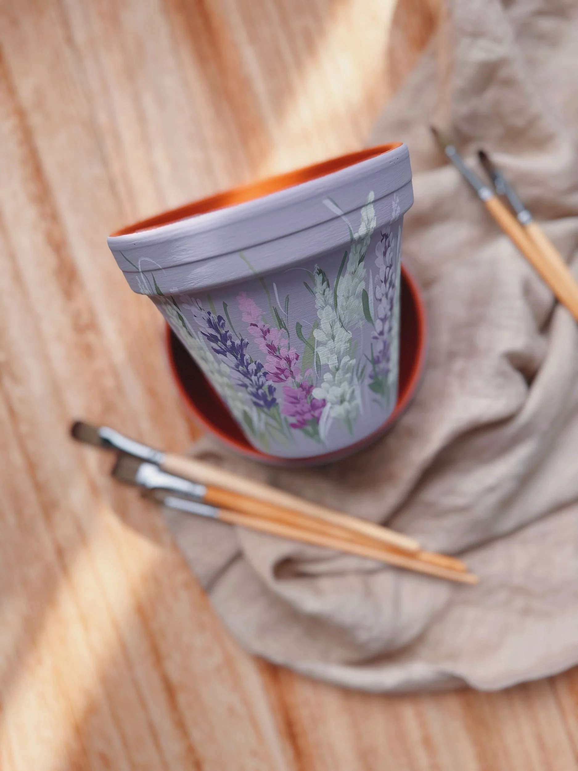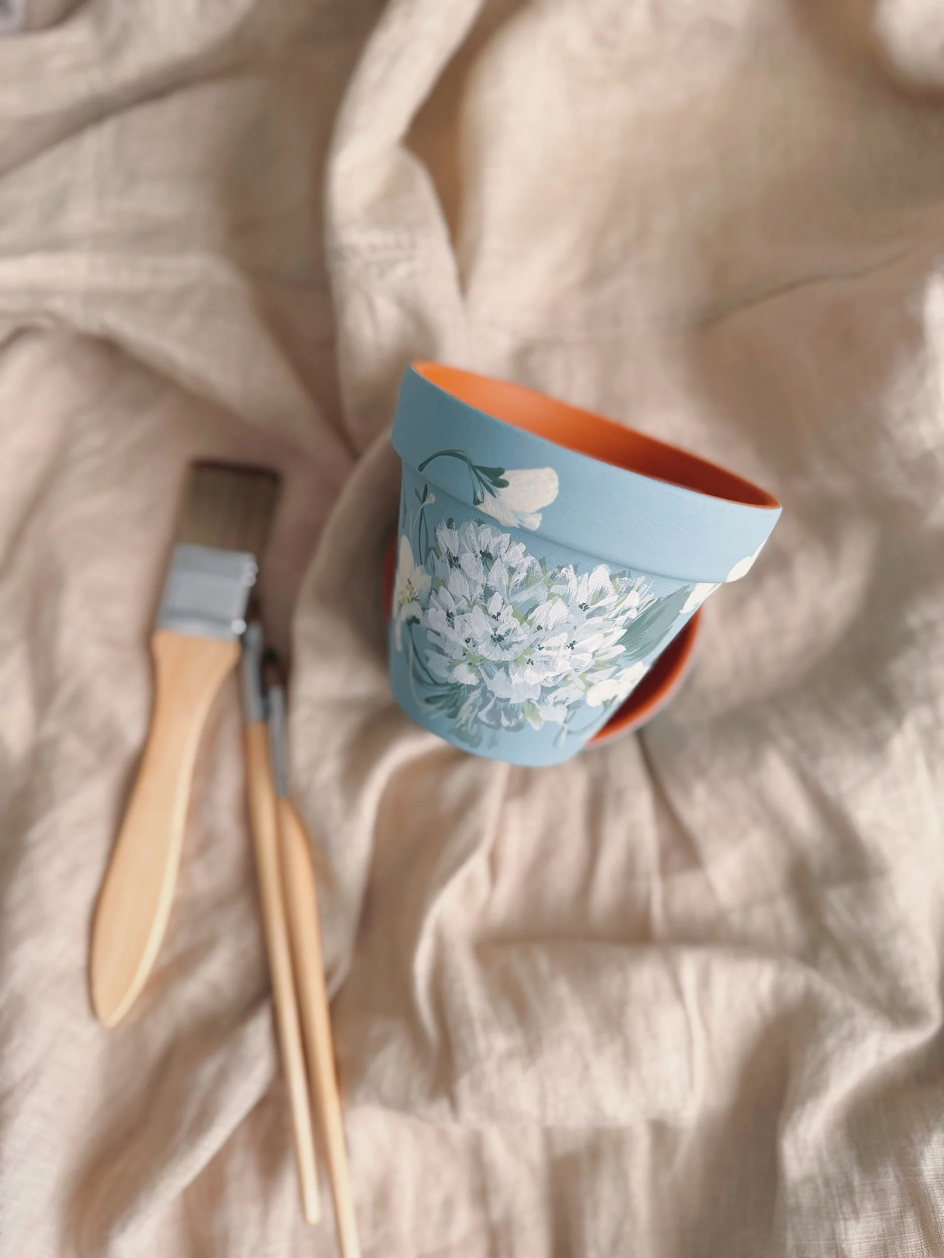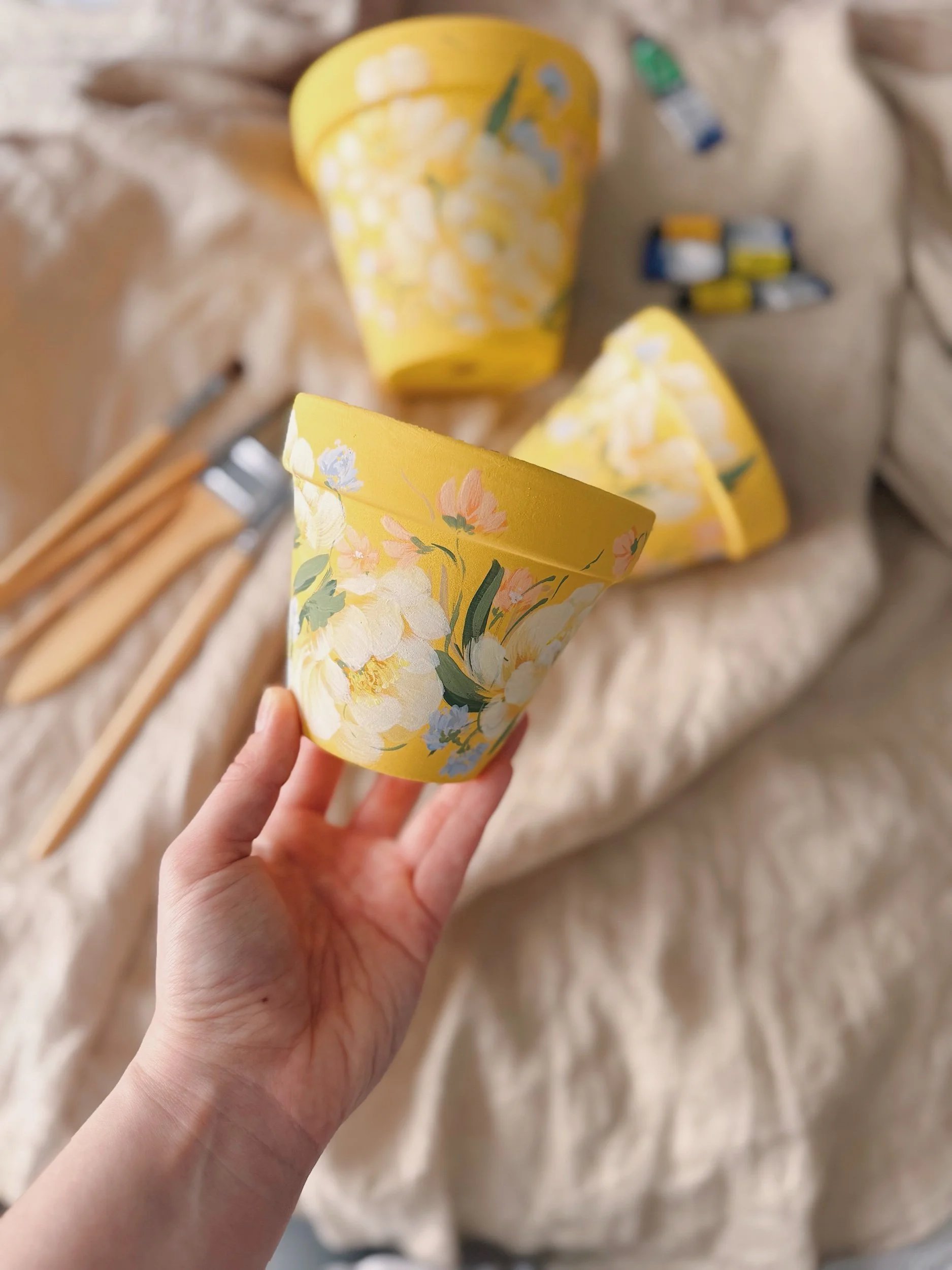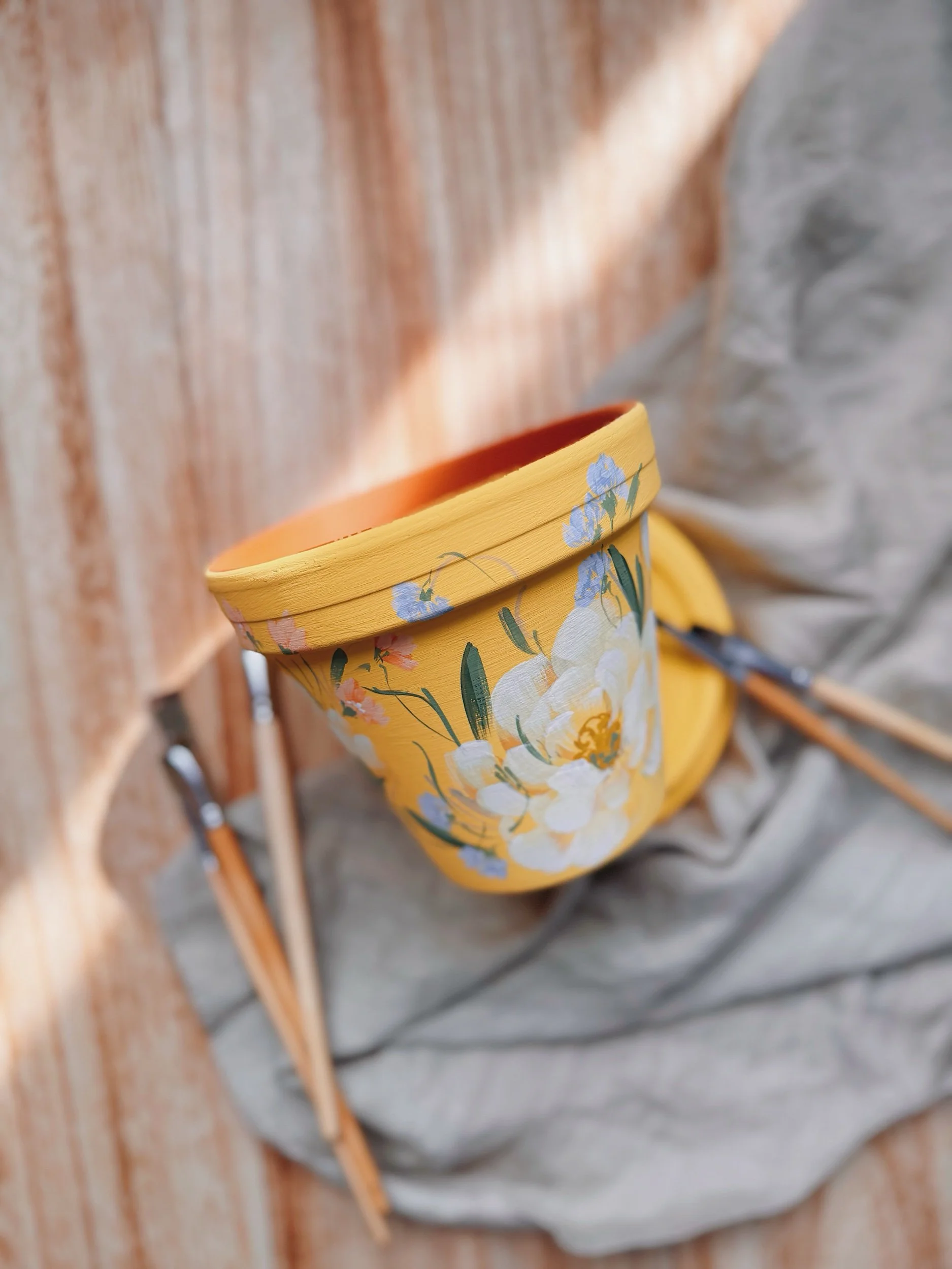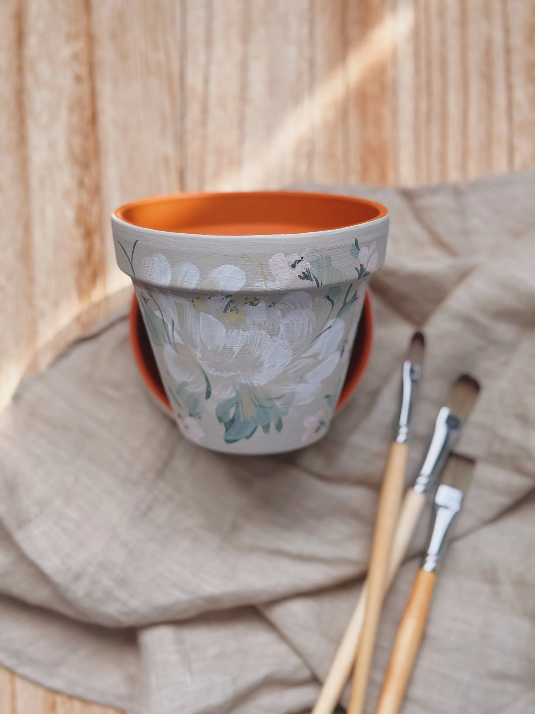 Six hand painted patterns painted on Terracotta planters. Spray coated with matte sealant to keep designs protected from water + the elements.